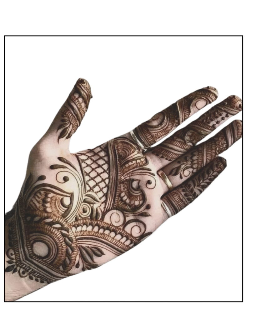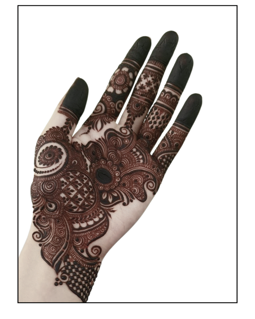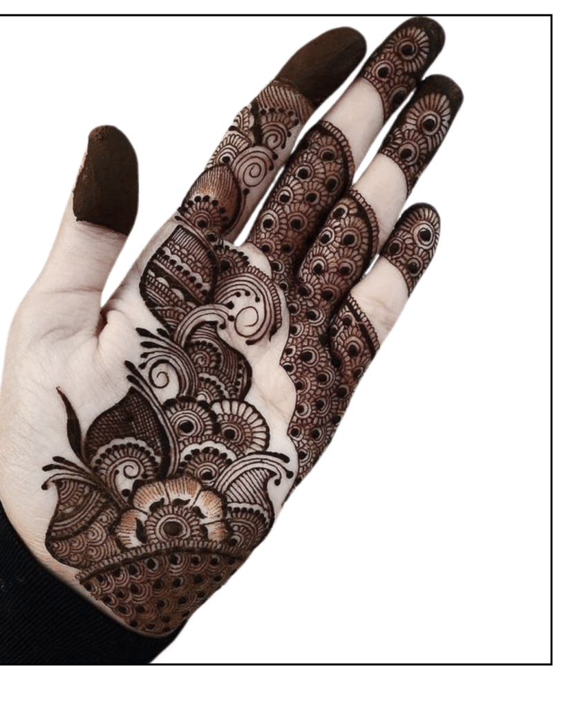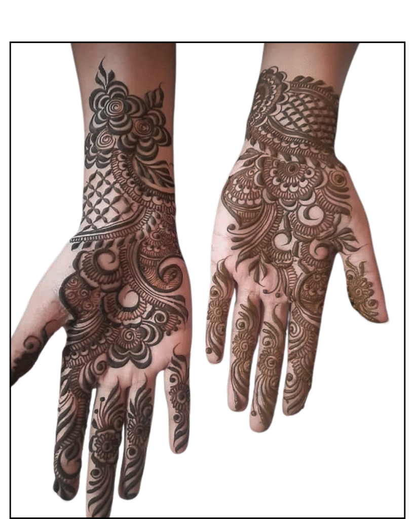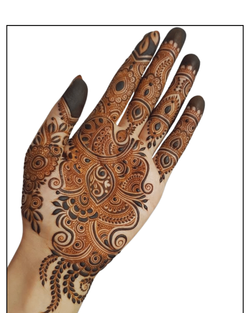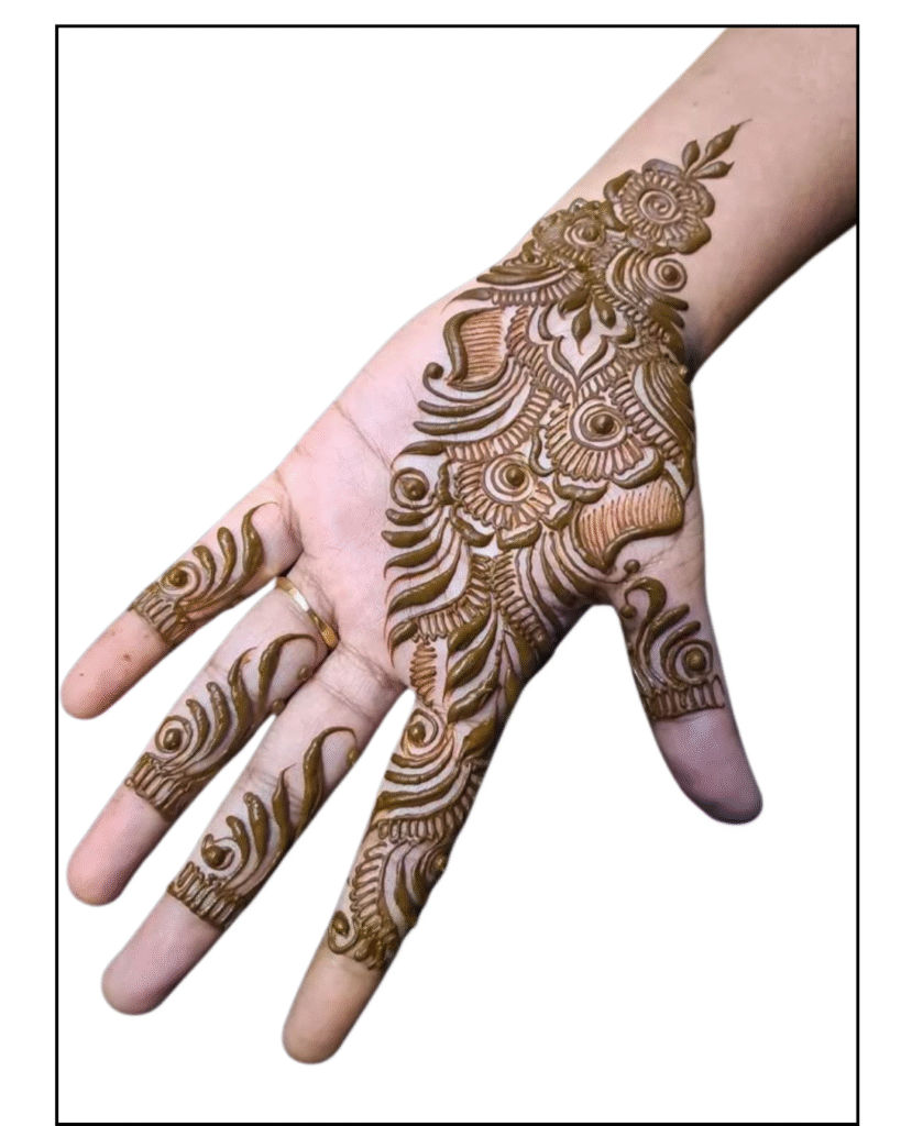 Modern design has expanded the scope of new artistry. For the mehendi design, minimalists prefer a delicate floral pattern that appears solitary on the palms. The bridges that are between the fingers have motifs like curling leaves, peacocks, and flowers that create consistency and balance. The backhand is the bold, centric area; as a peacock unfurls his feathers, that floral pattern passes through the wrist. This gradient design effect complements and makes the elegance so natural and enchanting. Let’s first examine our front-hand mehendi styles, as we are accustomed to applying mehendi art to both the front and back of the hand.